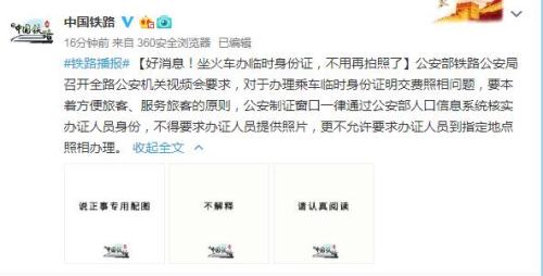 據(jù)中國鐵路總公司官方微博消息,公安部鐵路公安局召開全路公安機(jī)關(guān)視頻會(huì)要求,對于辦理乘車臨時(shí)身份證明交費(fèi)照相問題,要本著方便旅客、服務(wù)旅客的原則,公安制證窗口一律通過公安部人口信息系統(tǒng)核實(shí)辦證人員身份,不得要求辦證人員提供照片,更不允許要求辦證人員到指定地點(diǎn)照相辦理。