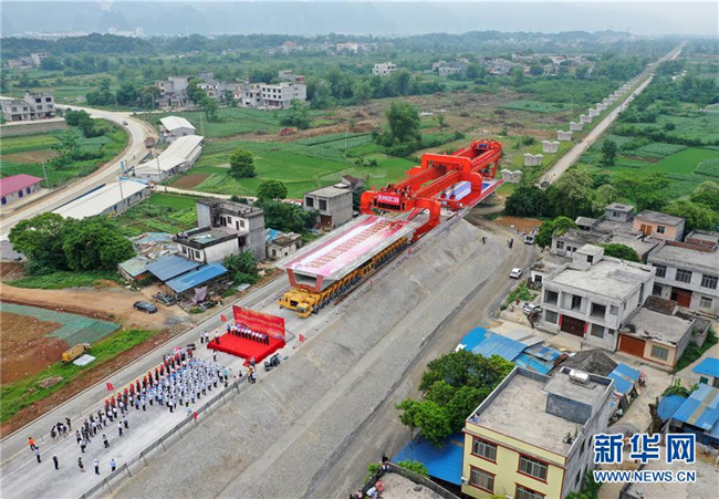 在廣西都安瑤族自治縣貴南高鐵澄江雙線特大橋施工現(xiàn)場(chǎng),工人在架設(shè)大橋首榀箱梁(4月29日無(wú)人機(jī)拍攝)。 新華社記者 陸波岸 攝