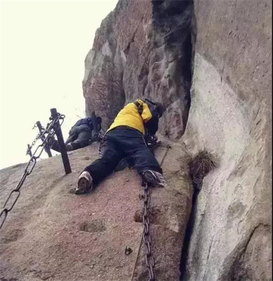 具有700多年歷史的長空棧道,在華山南峰東側(cè)山腰的萬仞絕壁上。鑿出來的幾個(gè)踏腳之處,鑲嵌石釘搭木椽搭建了一個(gè)百余米懸空的棧道,讓人望而卻步。如果你有恐高癥,僅僅看一眼都會(huì)讓你心驚膽戰(zhàn)。2013年,著名旅游網(wǎng)站“Smarter Travel”盤點(diǎn)全球最恐怖懸崖步道,將華山長空棧道列為全球十大最恐怖的懸崖步道之一。