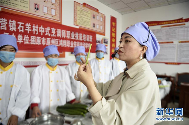 培訓(xùn)老師在中式烹調(diào)師職業(yè)技能培訓(xùn)班上為寧夏固原市原州區(qū)頭營鎮(zhèn)石羊村婦女講解食材選用規(guī)范(5月14日攝)。 新華社發(fā)(馮開華 攝)