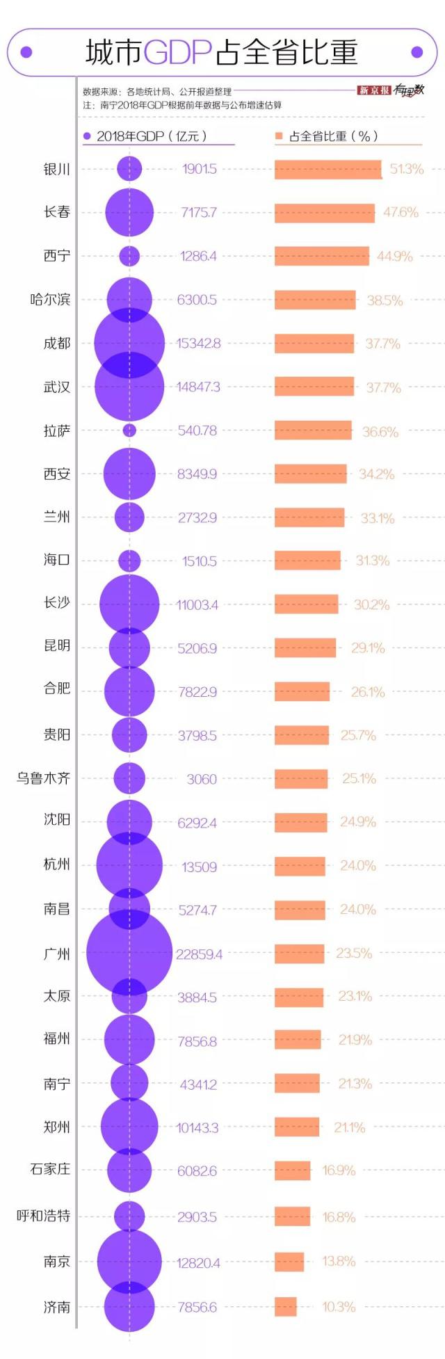 我們梳理了 27 個省和自治區(qū) 2018 年的地區(qū)生產(chǎn)總值后發(fā)現(xiàn),目前西藏、青海、寧夏、海南、甘肅五地 GDP 未破萬億,所以相應的拉薩、西寧、銀川、??凇⑻m州留給大家的記憶點可能不多;而像江蘇、山東兩地 GDP 可以排在全國前十,但其省會城市南京、濟南的 GDP 占全省比重不到 15%。