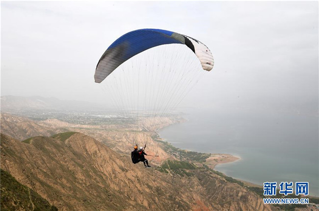 在永靖縣境內(nèi)的黃河三峽,游客體驗(yàn)高空滑翔傘(5月19日攝)。 坐落于甘肅省永靖縣境內(nèi)的黃河三峽,由炳靈峽、劉家峽、鹽鍋峽組成,屬黃河上游。黃河三峽兩岸人文景觀豐富,自然風(fēng)光秀美。 新華社記者 范培珅 攝
