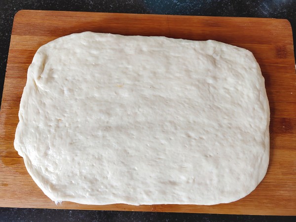5.輕拍面團(tuán)按扁,搟成長(zhǎng)薄餅狀。