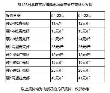水產(chǎn)養(yǎng)殖網(wǎng)今早上傳的5月23日北京京深海鮮市場(chǎng)紅殼蝦青殼蝦批發(fā)價(jià)顯示,個(gè)頭最?。?-4錢/只)、最便宜的小龍蝦批發(fā)價(jià)僅需11元/斤,比昨天又降了1元。而湖南、江蘇、廣東等地的價(jià)格也和北京差不多,武漢甚至低至9元/斤。