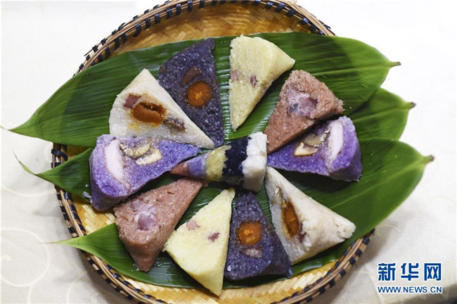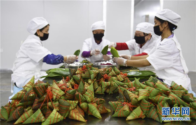 端午節(jié)將至,貴州省黔東南苗族侗族自治州臺(tái)江縣粽子加工企業(yè)加緊制作具有當(dāng)?shù)靥厣奈宀属占案魇紧兆?,滿足市場(chǎng)需求。