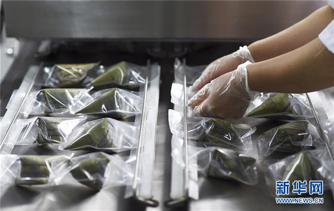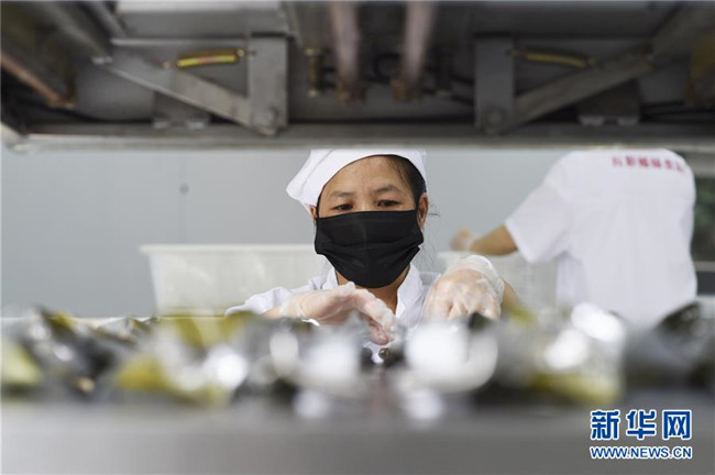 6月2日,在臺(tái)江縣一家食品生產(chǎn)企業(yè)車間,工人將煮熟的五彩粽進(jìn)行真空包裝?!⌒氯A社發(fā)(劉開(kāi)福 攝)