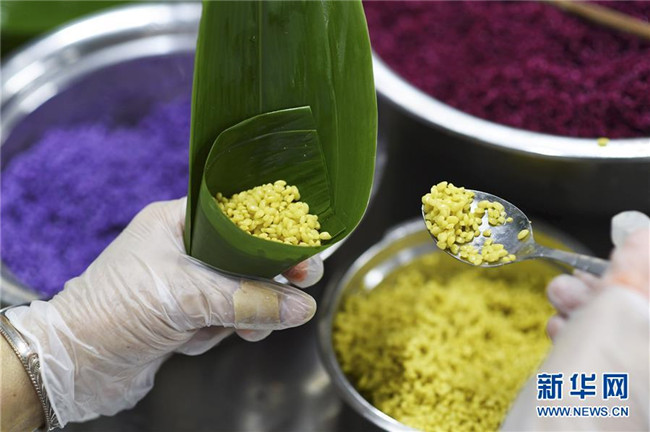 6月2日,在臺(tái)江縣一家食品生產(chǎn)企業(yè)車間,工人在包制五彩粽。 新華社發(fā)(劉開(kāi)福 攝)