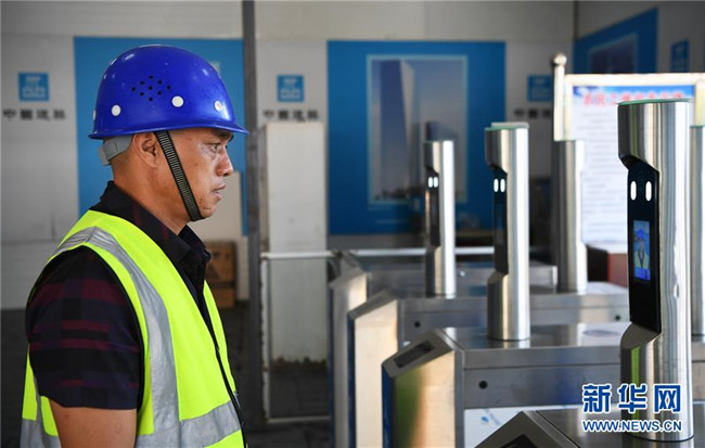 6月5日,重慶化龍橋超高層項(xiàng)目工人通過人臉識(shí)別系統(tǒng)離開工地。 新華社記者 王全超 攝