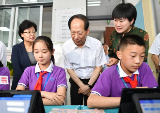 6月10日,石泰峰來到銀川市西夏區(qū)鎮(zhèn)北堡鎮(zhèn)華西中學(xué),調(diào)研農(nóng)村中學(xué)運(yùn)用“互聯(lián)網(wǎng)+教育”資源,推進(jìn)智慧教育教學(xué)應(yīng)用情況。