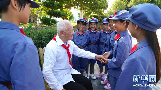 抗戰(zhàn)老兵萬更志(左二)給江西省于都縣長征源小學(xué)的學(xué)生講述紅色故事(2018年9月29日攝)。新華社記者 胡晨歡 攝