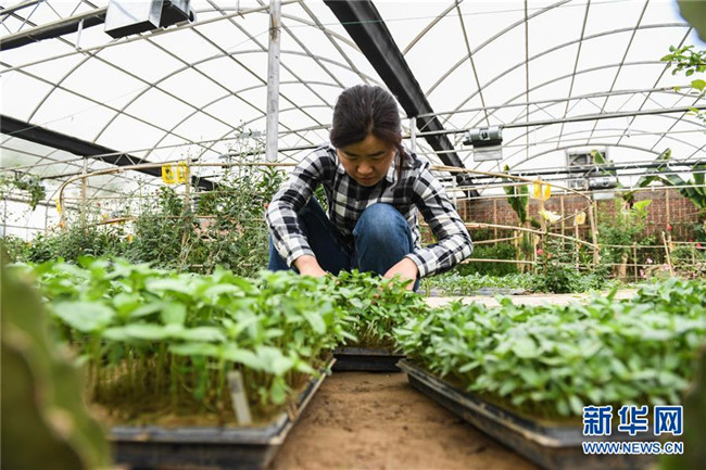 5月7日,在庫布其沙漠恩格貝生態(tài)示范區(qū)內,一名農(nóng)藝師整理培育的沙生植物苗。 新華社記者 劉磊 攝
