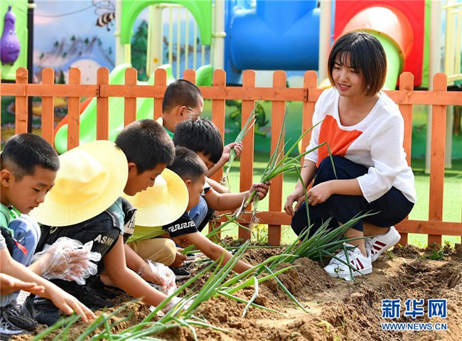 6月17日,樂亭縣大相各莊鄉(xiāng)幼兒園老師在勞動(dòng)實(shí)踐基地的小菜園里教孩子們栽種大蔥。新華社記者楊世堯攝