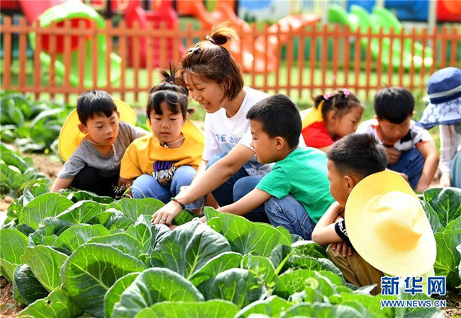 6月17日,樂亭縣大相各莊鄉(xiāng)幼兒園老師在勞動(dòng)實(shí)踐基地的小菜園里給孩子們講解甘藍(lán)菜的生長過程。新華社記者楊世堯攝