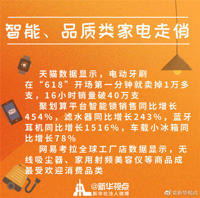 除了滿足“剛需”的大家電,提升生活品質(zhì)的小家電也十分走俏。天貓數(shù)據(jù)顯示,電動牙刷在“618”開場第一分鐘就賣掉1萬多支,16小時銷量破40萬支。聚劃算平臺智能鎖銷售額同比增長454%,濾水器同比增長243%,藍(lán)牙耳機(jī)同比增長1516%,車載小冰箱同比增長78%。在網(wǎng)易考拉全球工廠店,無線吸塵器、家用射頻美容儀等商品成最受歡迎消費品類。