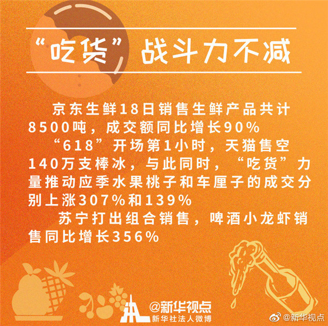 京東生鮮18日銷售生鮮產(chǎn)品共計8500噸,成交額同比增長90%。6月16日第1小時,天貓售空140萬支棒冰,“吃貨”力量推動應(yīng)季水果桃子和車?yán)遄映山活~分別上漲307%和139%。蘇寧打出組合銷售,啤酒小龍蝦銷售同比增長356%……