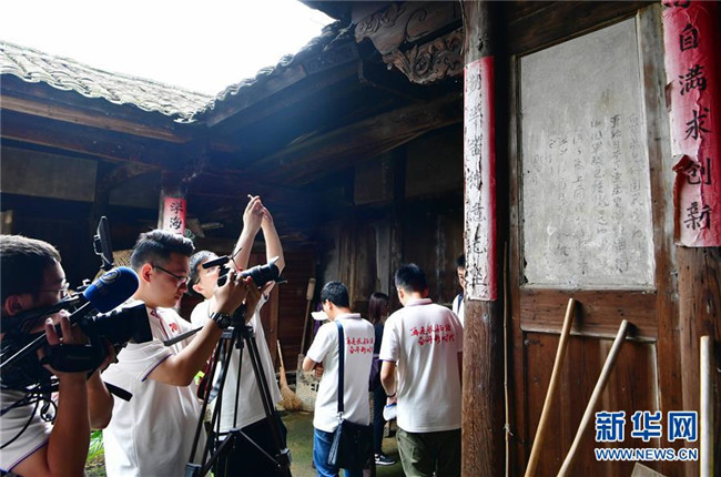 6月17日,在長(zhǎng)汀縣南山鎮(zhèn)中復(fù)村的觀壽公祠,媒體記者在重溫當(dāng)年紅軍長(zhǎng)征前的場(chǎng)景。 新華社記者魏培全攝