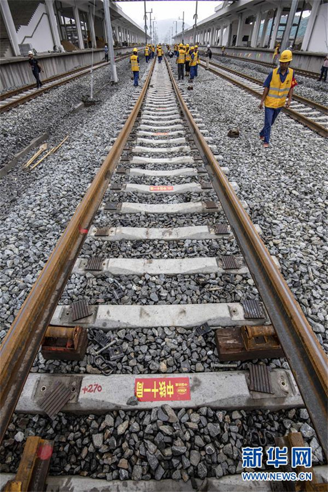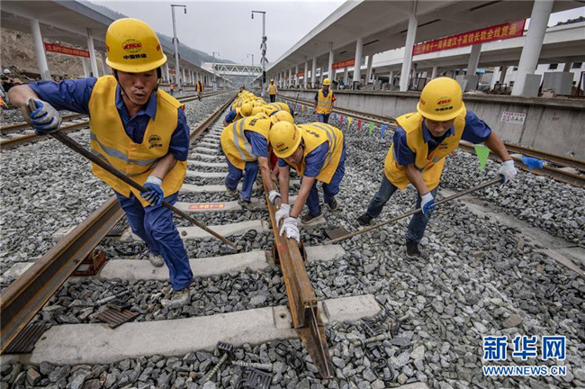 6月22日,中鐵十一局三公司職工在湖北省十堰市十堰北站為漢十高鐵最后一組500米長軌鋪設(shè)做準(zhǔn)備。新華社記者 杜華舉 攝