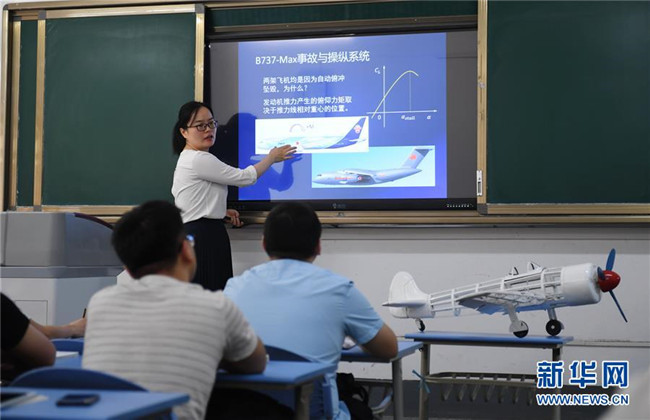 在西北工業(yè)大學(xué)航空學(xué)院,副教授劉艷在飛行器設(shè)計(jì)與工程專業(yè)的飛行動(dòng)力學(xué)課程上分析波音客機(jī)墜毀原因(6月14日攝)。新華社記者李一博攝