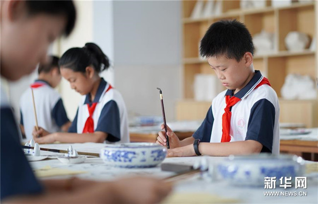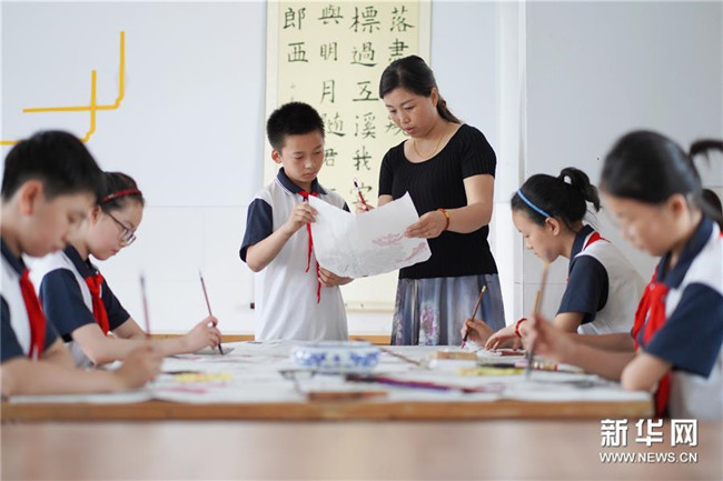 6月26日,內(nèi)丘縣實(shí)驗(yàn)小學(xué)老師在指導(dǎo)學(xué)生練習(xí)國(guó)畫創(chuàng)作。新華社記者 朱旭東 攝