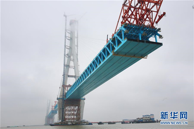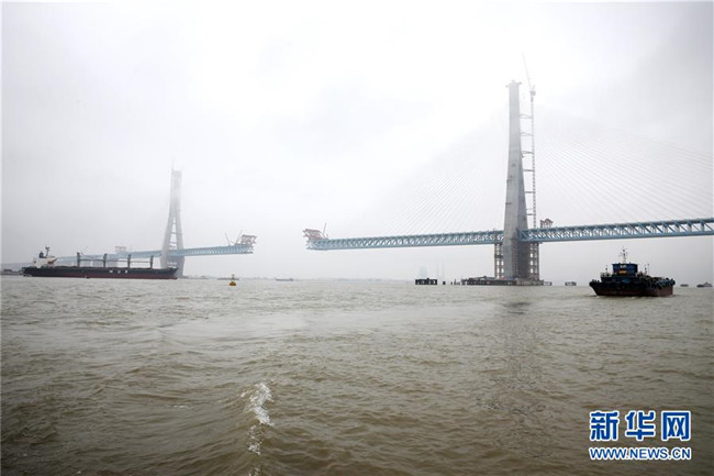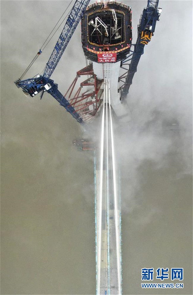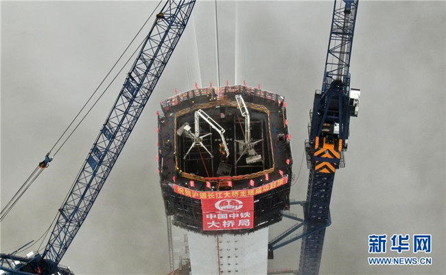 當(dāng)日,滬通長(zhǎng)江大橋南主塔順利封頂。至此,該橋兩座高達(dá)330米的主塔全部建成,標(biāo)志著世界最大跨度公鐵兩用斜拉橋建設(shè)取得了關(guān)鍵性進(jìn)展。滬通長(zhǎng)江大橋全長(zhǎng)11072米,主橋長(zhǎng)2296米,主跨1092米,是滬通鐵路全線的控制性工程,設(shè)計(jì)為上層6車道高速公路,下層4線鐵路。新華社發(fā)(許叢軍攝)