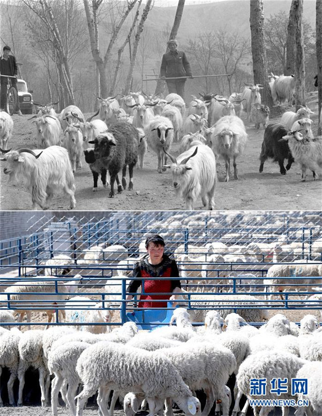 這是一張拼版照片,上圖為1993年4月27日,陜西省延安市梁村鄉(xiāng)的白生有老漢在放養(yǎng)自家的羊群(新華社記者陶明攝);下圖為2019年4月23日,延安市安塞區(qū)化子坪鎮(zhèn)河西溝湖羊養(yǎng)殖場的工作人員在喂羊(新華社記者劉瀟攝)。新華社發(fā)