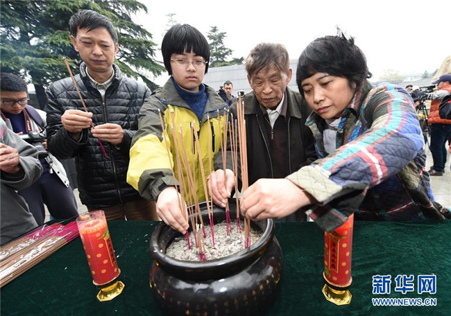 南京大屠殺幸存者常志強(qiáng)(右二)率親屬在侵華日軍南京大屠殺遇難同胞紀(jì)念館內(nèi)的遇難者名單墻前焚香(2015年4月5日攝)。新華社記者孫參攝