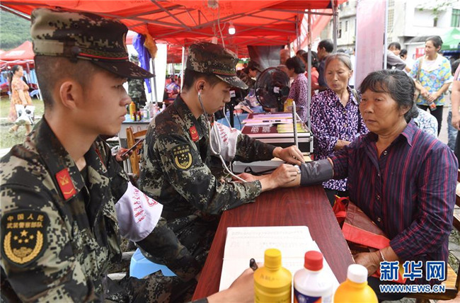 在四川長寧地震災(zāi)區(qū)安置點(diǎn),武警宜賓支隊(duì)衛(wèi)生隊(duì)黨小組成員為群眾提供醫(yī)療服務(wù)(6月20日攝)。新華社記者 劉坤 攝