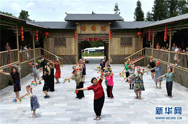 7月1日,游客在湖北省恩施土家族苗族自治州宣恩縣珠山鎮(zhèn)車洞坪民宿旅游區(qū)體驗土家族“八寶銅鈴舞”。 新華社發(fā)(宋文 攝)