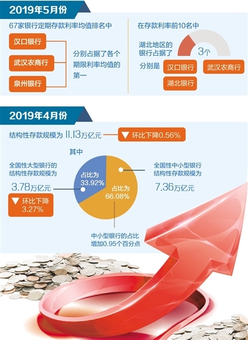與此同時,據(jù)融360大數(shù)據(jù)研究院監(jiān)測數(shù)據(jù)顯示,在2019年5月份67家銀行定期存款利率均值排名中,漢口銀行、武漢農(nóng)商行、泉州銀行分別占據(jù)了各個期限利率均值第一。在存款利率前10名中,湖北地區(qū)銀行占據(jù)了3個,分別是漢口銀行、武漢農(nóng)商行和湖北銀行。湖北地區(qū)定期存款利率一直處于較高水平。