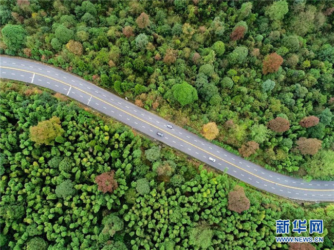 車輛行駛在國(guó)家第一條四車道盤山公路泰井高速上(2018年11月21日無(wú)人機(jī)拍攝)。新華社記者 胡晨歡 攝