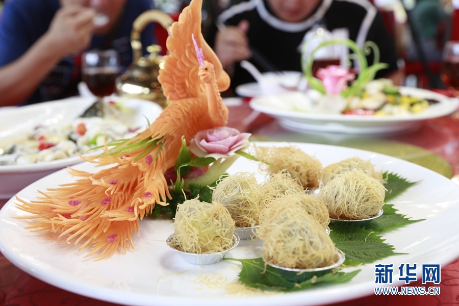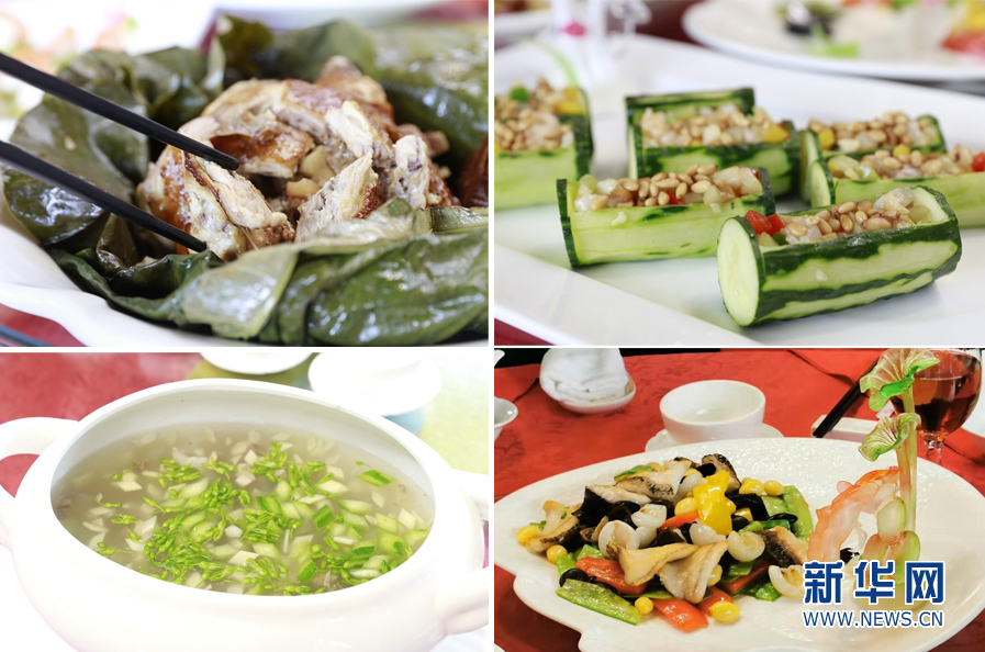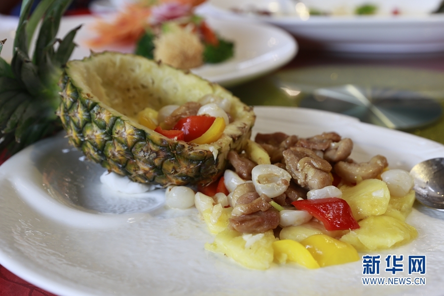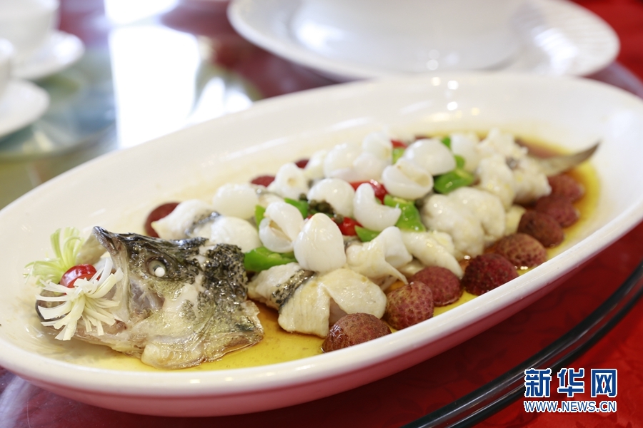本次荔枝宴共有泮塘綠叢荔荷雞、魚(yú)潛荔水芳四溢,以及禾桿藏珠荔香透等10道菜肴。新華網(wǎng) 林曉蕾攝