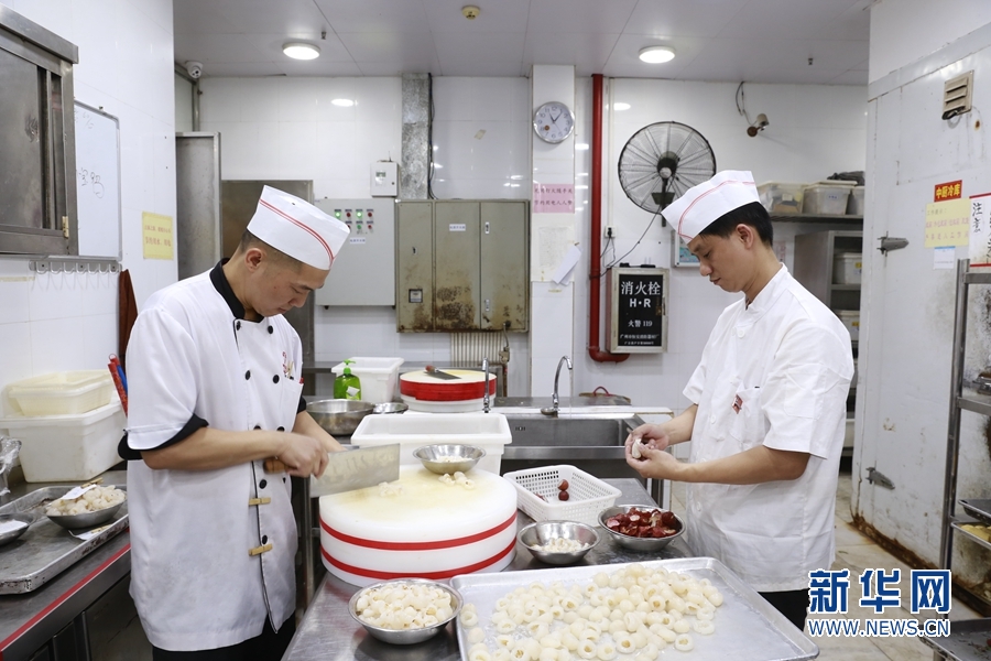 點(diǎn)心師傅用荔枝在創(chuàng)作菜肴。新華網(wǎng) 林曉蕾攝