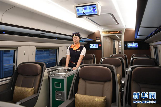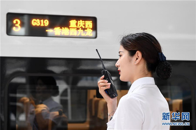 7月11日,乘務(wù)員在G319次列車上做發(fā)車前的準(zhǔn)備工作。當(dāng)日,重慶至香港直達高鐵正式開通,此次首發(fā)的G319次復(fù)興號列車運行速度350km/h,沿途經(jīng)停遵義、貴陽東、桂林西、肇慶東、廣州南和深圳北站。列車由重慶西站至香港西九龍站全程運行需7小時37分鐘,全程票二等座票價為660元。目前內(nèi)地與香港聯(lián)通的高鐵車站已增加到58個。新華社記者唐奕攝