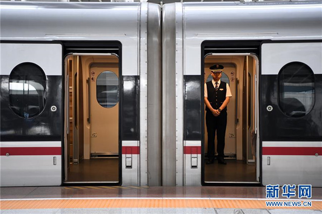 7月11日,乘務(wù)員在G319次列車上等待旅客上車。當(dāng)日,重慶至香港直達高鐵正式開通,此次首發(fā)的G319次復(fù)興號列車運行速度350km/h,沿途經(jīng)停遵義、貴陽東、桂林西、肇慶東、廣州南和深圳北站。列車由重慶西站至香港西九龍站全程運行需7小時37分鐘,全程票二等座票價為660元。目前內(nèi)地與香港聯(lián)通的高鐵車站已增加到58個。新華社記者唐奕攝