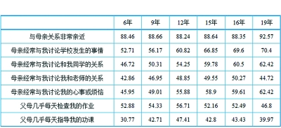 高學(xué)歷父母檢查作業(yè)的頻次不高。如果以父母教育水平作為社會階層的劃分依據(jù),數(shù)據(jù)顯示,社會階層越高的父母陪伴子女高頻率參加文化活動的比重越大。例如,父母雙方受教育程度最大為“大學(xué)及以上”的學(xué)生中有16.69%的人表示“上個月與父母外出看電影、演出、體育比賽的頻率為每周兩次以上”,相比之下父母雙方受教育程度最大為“小學(xué)”的學(xué)生中只有8.65%的人報告此選項。而且社會階層越高的父母和子女的關(guān)系越親近。例如,母親受教育年限為19年的學(xué)生中有92.57%的人選擇了“我和媽媽的關(guān)系非常親近”;70.40%的人表示“母親經(jīng)常與我討論學(xué)校發(fā)生的事情”;62.42%的人認為“母親經(jīng)常與我討論我的心事或煩惱”。