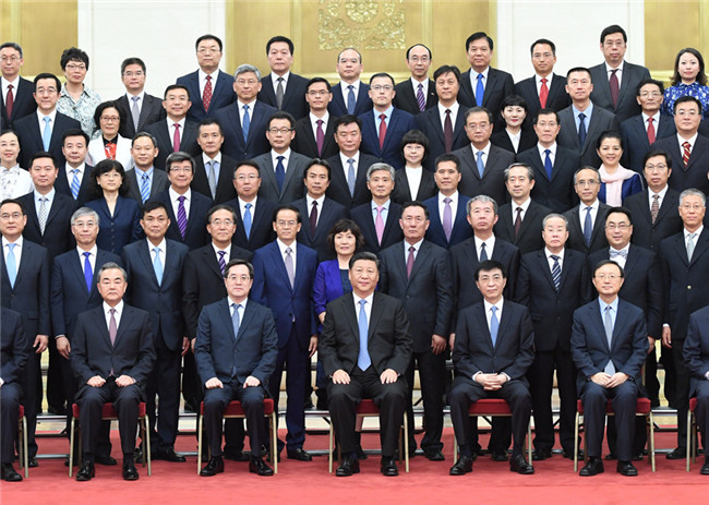 7月17日,黨和國家領(lǐng)導(dǎo)人習(xí)近平、王滬寧等在北京人民大會堂會見回國參加2019年度駐外使節(jié)工作會議的全體使節(jié)。 新華社記者 張領(lǐng) 攝