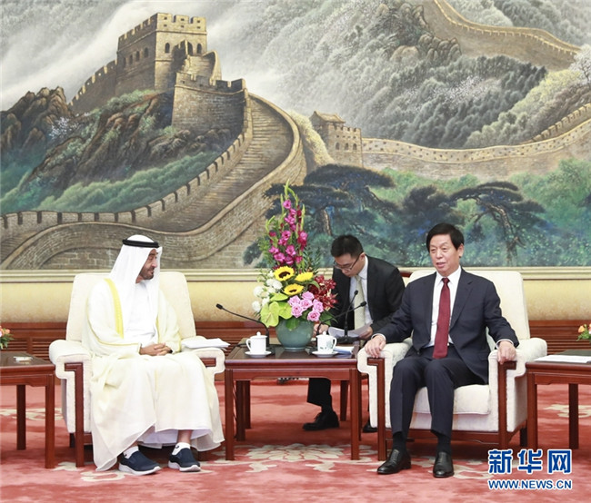 全國人大常委會委員長栗戰(zhàn)書22日在人民大會堂會見阿聯(lián)酋阿布扎比王儲穆罕默德。