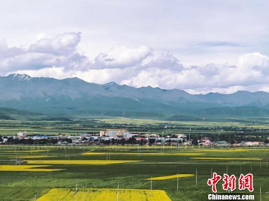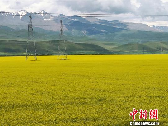 祁連山脈雪頂銀裝素裹,與油菜花交相輝映?!堟骸z