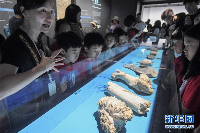 7月24日,小朋友在湖南省博物館聽(tīng)工作人員講解化石展品。