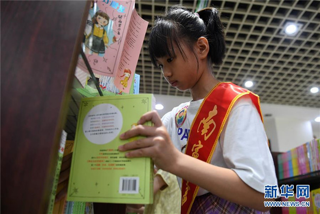 當日,廣西南寧書城在“2019年暑假好書伴我成長”沙龍活動中,征集部分小朋友在書城里擔任“小小圖書管理員”,讓孩子們親身體會到圖書管理員的艱辛與快樂。 新華社記者 陸波岸 攝