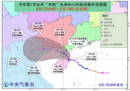 據(jù)中央氣象臺網(wǎng)站消息,中央氣象臺8月1日6時繼續(xù)發(fā)布臺風(fēng)藍色預(yù)警,今年第7號臺風(fēng)“韋帕”(熱帶風(fēng)暴級)的中心今天凌晨1點50分前后在海南省文昌市沿海登陸。其中,廣東、廣西、福建、海南等地有大到暴雨。