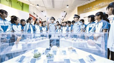 近日,在山東省棗莊市臺兒莊古城中學(xué)的禁毒教育基地,民警向?qū)W生介紹新型毒品的種類、特征和危害,提升他們識毒、防毒、拒毒的意識和能力。新華社記者 高啟民攝