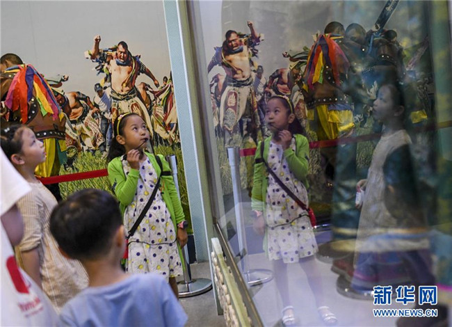 在新疆博物館的講解結(jié)束后,一名小游客通過電話手表和文藝揚(yáng)(右)合影留念(8月8日攝)。 新華社記者 王菲 攝