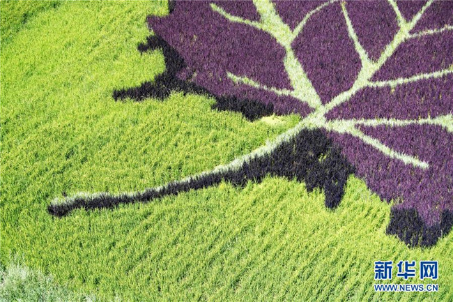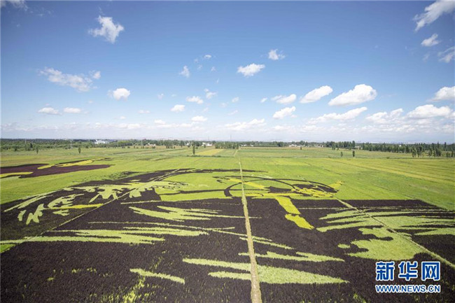 這是8月18日在新疆察布查爾錫伯自治縣納達(dá)齊牛錄鄉(xiāng)稻田畫基地拍攝的稻田畫。
