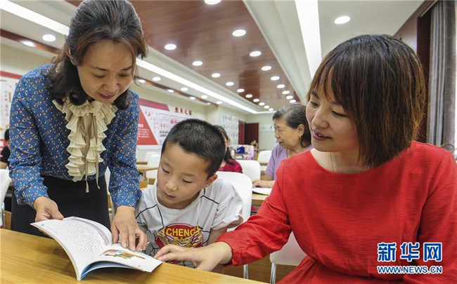 老師(前左)和家長(zhǎng)(前右)一起在永清縣城區(qū)街道公益書屋指導(dǎo)孩子誦讀(8月20日攝)。新華社記者 李曉果 攝