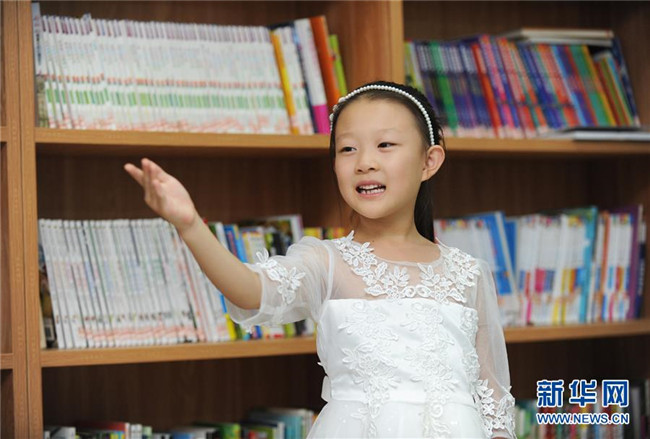 一名孩子在永清縣城區(qū)街道公益書屋內(nèi)誦讀經(jīng)典詩文(8月20日攝)。新華社記者 李曉果 攝