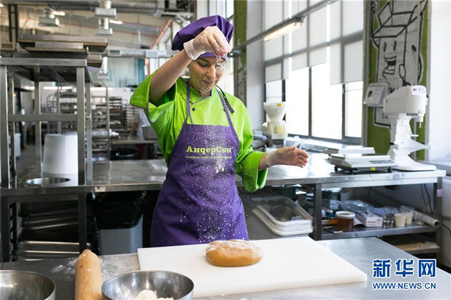 8月28日,在俄羅斯首都莫斯科,糕點師尤利婭將干面粉撒在揉好的面團上。 新華社記者 白雪騏 攝
