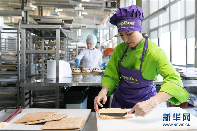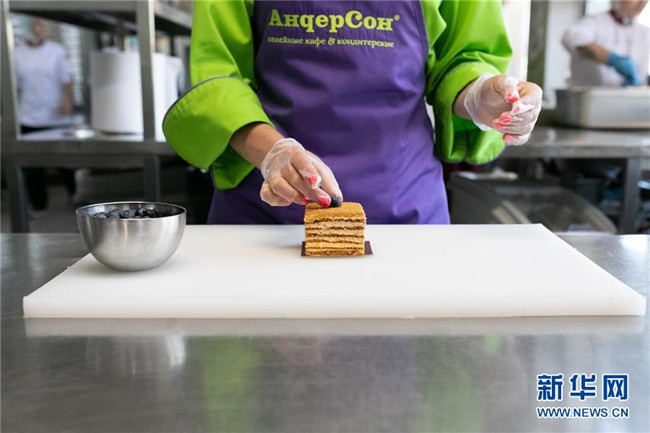 8月28日,在俄羅斯首都莫斯科,糕點師尤利婭將打發(fā)的奶油抹平。 新華社記者 白雪騏 攝