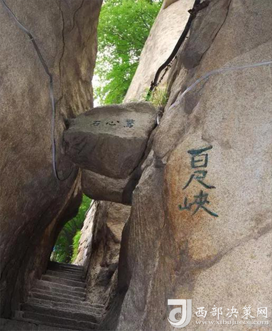 出千尺㠉不遠(yuǎn)是百尺峽,這里是登山第二道險(xiǎn)關(guān)。兩壁高聳,中間夾有一塊從天而降的巨石,上刻“驚心石”三個(gè)大字,游人要從石下小路穿過,確實(shí)驚心動(dòng)魄。此后還有仙人橋、俯渭崖、黑虎嶺等小險(xiǎn)處,就到了登山第三道險(xiǎn)關(guān)老君犁溝,這是夾在陡峭石壁之間的一條溝狀險(xiǎn)道,深不可測(cè),有石階570有余。
