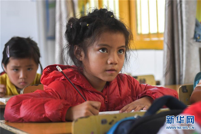 十八洞小學(xué)一年級(jí)學(xué)生施蓉婭在上課時(shí)認(rèn)真聽講(9月4日攝)。新華社記者 陳澤國 攝